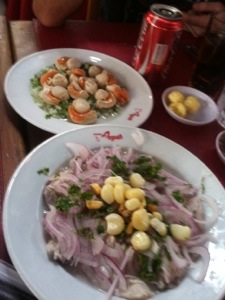For lunch that decided that we wanted to head back to Mercado Central to have a delicious seafood lunch from the seafood market inside the building. Being a bunch of big fat Americans, we ordered a fish empanada, scallops, seabass ceviche,octopus and a plate of uni. Really looking forward to a delicious lunch that included a giant bowl of fresh uni prepared table side I have to say this was one of the worst meals I’ve ever eaten. The uni while a beautiful color, tasted and smelled like it had been left out in the sun soaking in fish juice for about a week. When we didn’t touch it the waiter commented that it was too strong for us, but after smelling and tasting it I really felt like sucking on a hobos toes would’ve induced less of a gag reflex. If anyone reading this knows about traditional preparation of sea urchin in Chile please let me know whether I’m lacking this acquired taste or if I did the right thing to avoid food poisoning. I also wasn’t thrilled with any of the other dishes either – the octopus was kind of fishy, the ceviche was okay, the scallops were probably my favorite, and served with their egg sac or something, and the emapanada was good.
