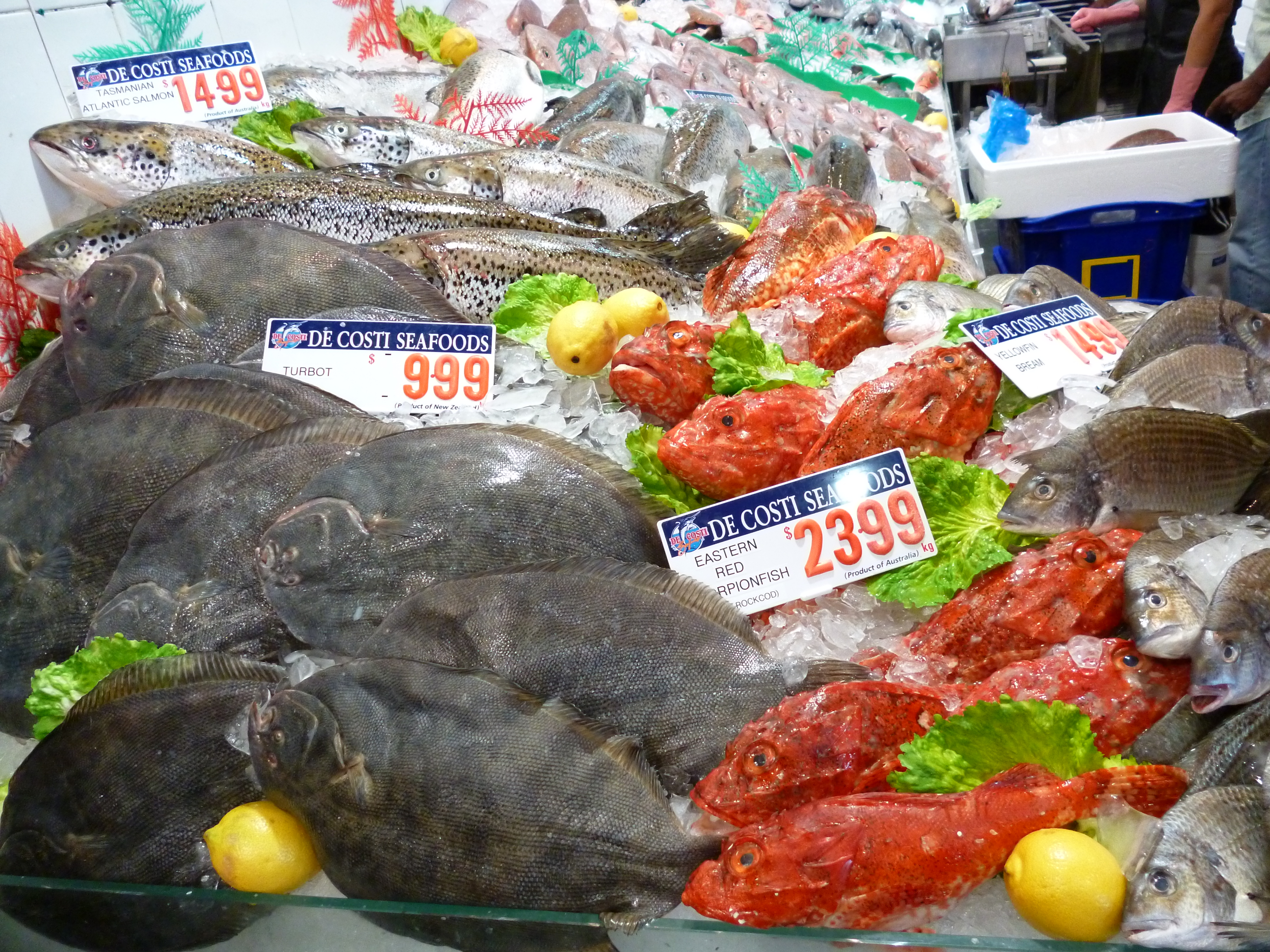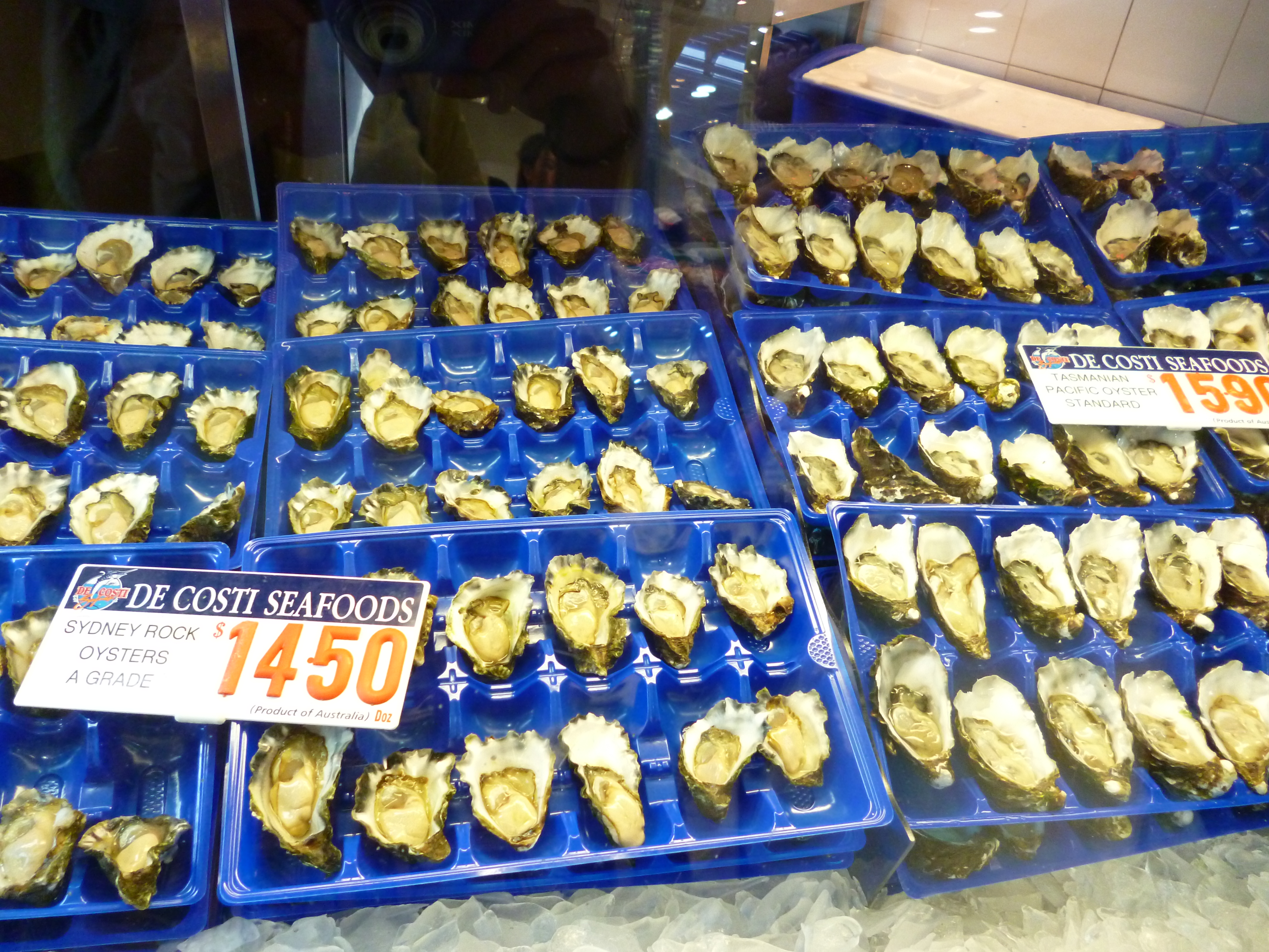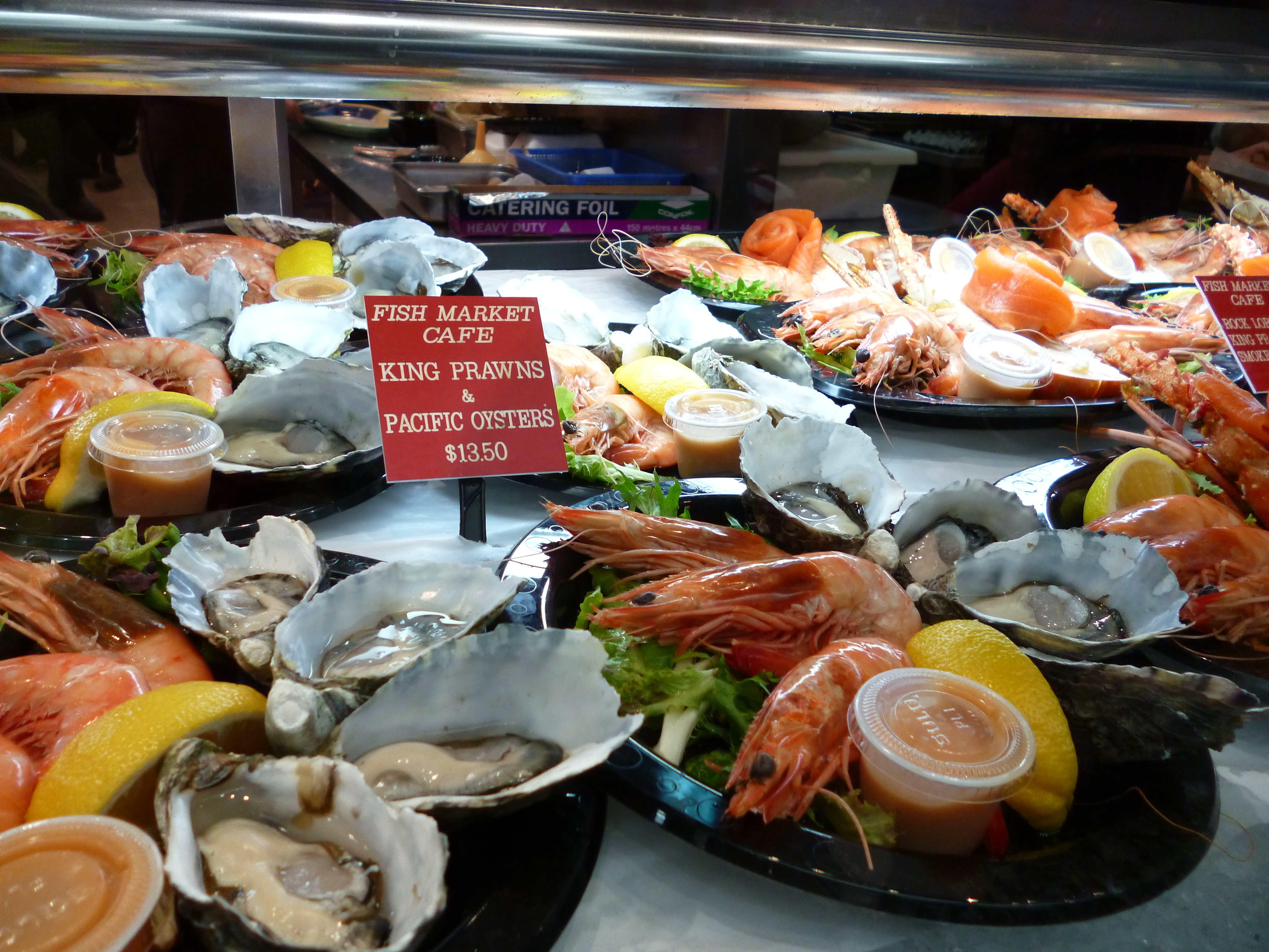 Walking into the Sydney Fish Market I think I have an idea what it’s like to be a male in a strip club for the first time. Instead of tits and ass everywhere I was immediately struck with a culinary boner for the pornographic array of fresh seafood. After years of seeing foods like this on the internet and in magazines, here they were in person! There were dozens of fresh shucked oysters on the half-shell sitting on ice. Raw and cooked prawns as big as my forearm in beautiful shades of pink and orange. Lobsters the size of infants. Fish that could stunt double for Moby Dick. My head was spinning and I couldn’t figure out where to first direct my attention. But going with the whole porn analogy, I went with the obvious choice of raw Tasmanian Pacific oysters.