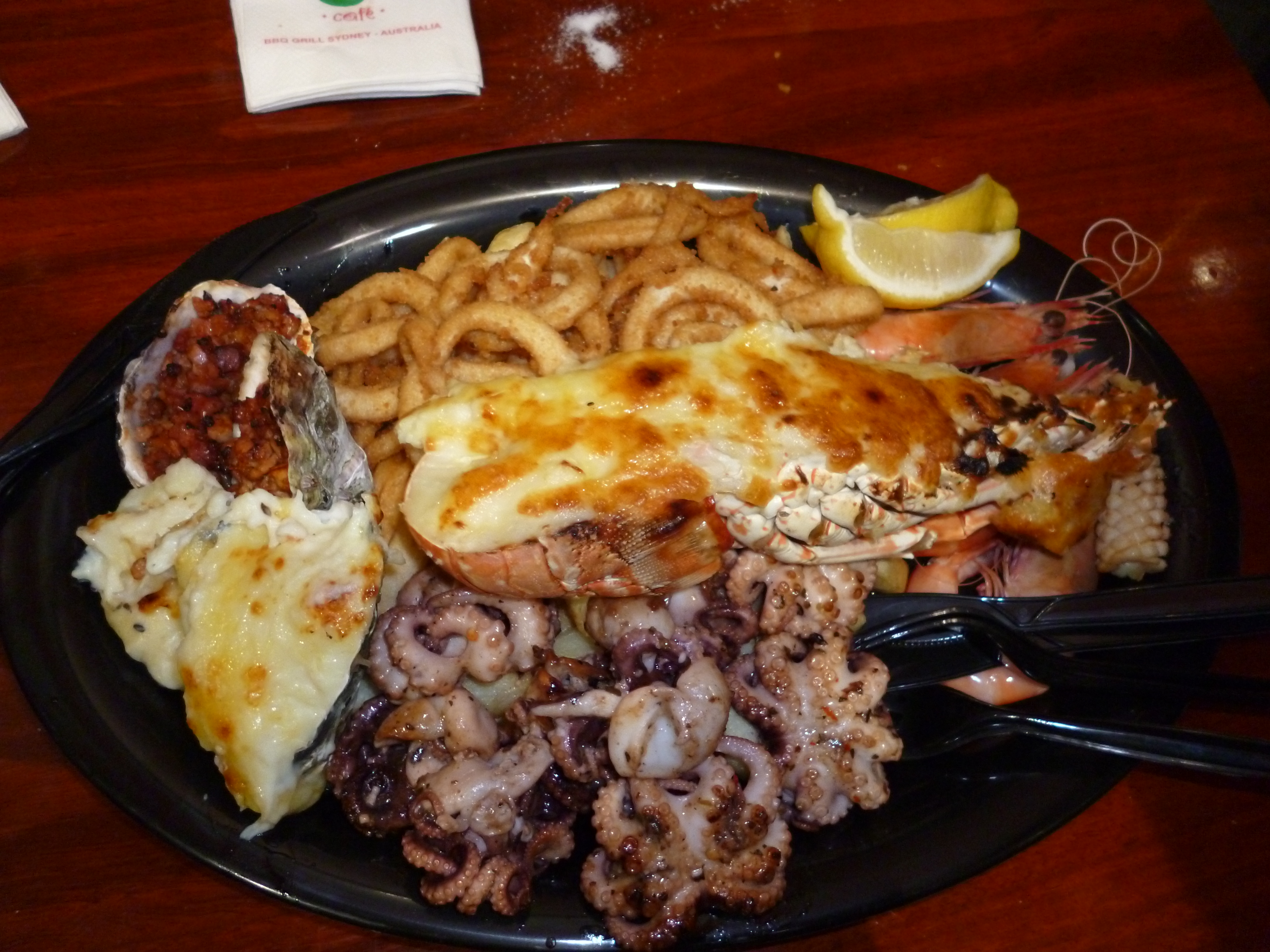 After sucking down a tray of oysters garnished only with a squeeze of lemon, we headed into a few of the other markets with equally amazing arrays and then into the food court. Entering the food court I felt at home. Or at least like I blended in really well. All the counters were packed with Asians oogling the food displays. Throngs of Asians in a food market is as good of an indication of awesome food as walking into a restaurant and someone taking a dump on your plate is an indication of a bad one. And with that strong endorsement we agreed on a mixed platter, which sadly was kind of a disappointment. If I had been wiser I would’ve just looked at the nearest happy looking Chinese table and pointed to what they had but instead we went with the delicious sounding lobster Mornay platter – which for your safety, if you ever go to the Sydney fish market is a lobster covered in mashed potatoes and cheese. Yes. We fucked up. On the bright side, the jumbo prawns were delicious as was sucking the juice right out of their heads. And the BBQ baby octopus sprinkled with garlic was awesome as well. Stupid potatoes and cheese ruining a perfectly good crustacean.