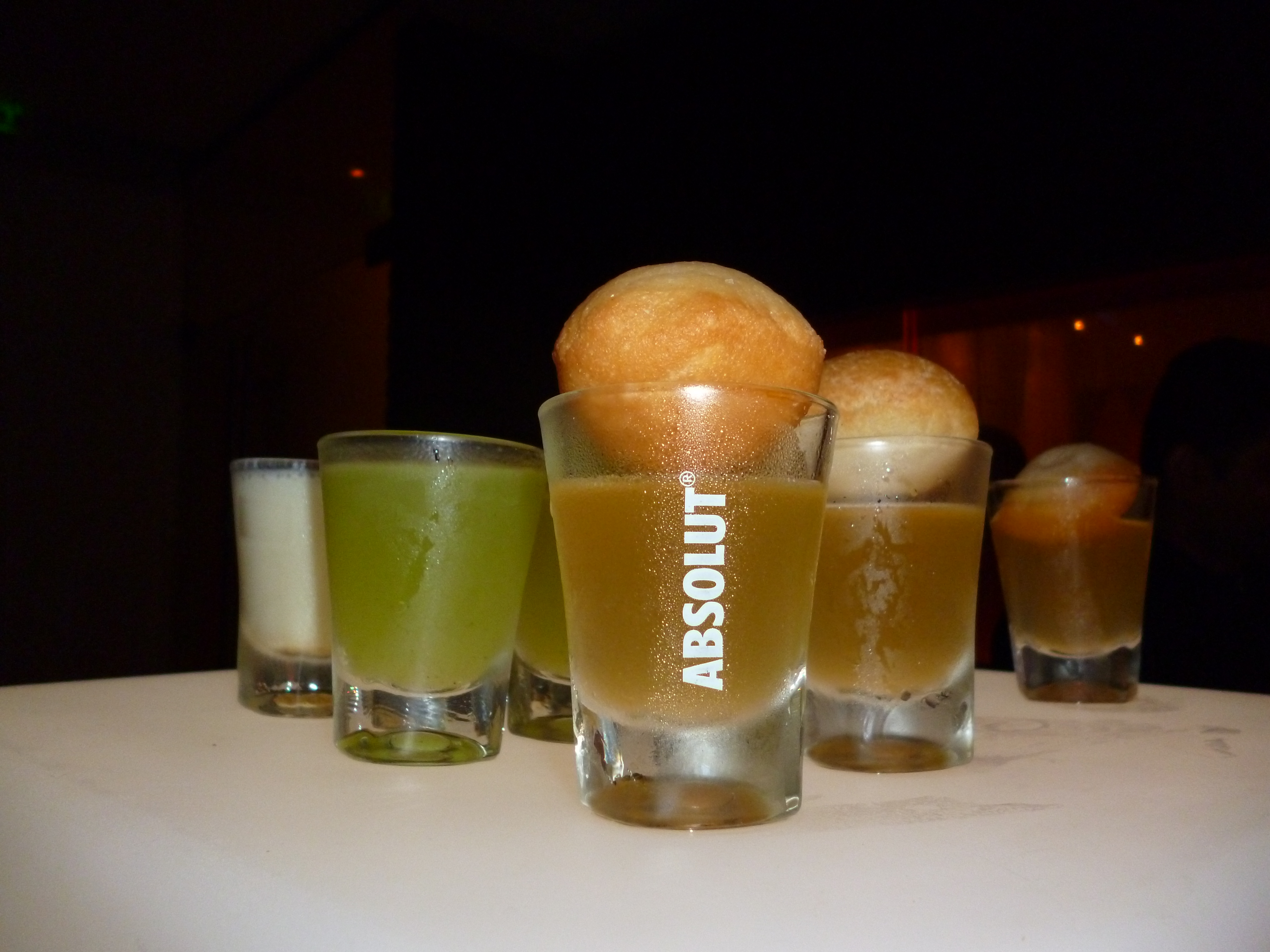 He asked me what I would like to drink and not wanting to be a pain in the ass I went with my standard, “I’ll have whatever you’re having,” and hoped he wasn’t a scotch drinker. He wasn’t, but apparently a light drink was a boilermaker – half a beer and a shot of Jack Daniels. FML. Although I wasn’t able to chug it, I was able to hold it down and then the bartender came over with some shots. Absolut was sponsoring the party and he had created some shots using Absolut and Indian spices which I was too intrigued to turn down. Sorry liver.