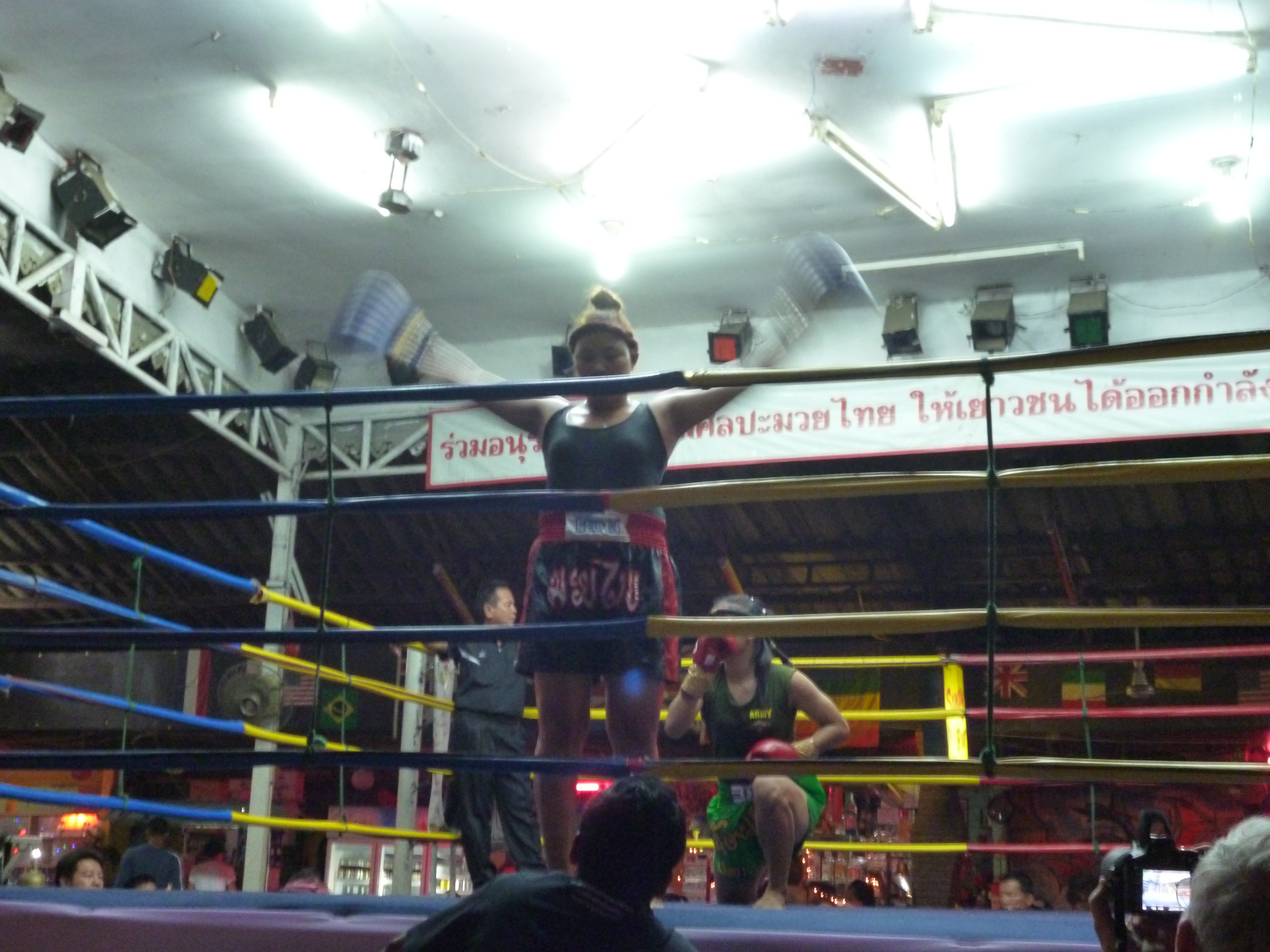 After watching a few kids beat each other up, next came the women’s match. The first girl was big for an Asian girl, but more or less the size of your average American. Then the second girl came out and I stand corrected, she was the size of your average American…from the south or middle America. I try not to bash other girls looks, because you know, eating disorders and all those other #whitepeopleproblems but as the two girls started fighting and the bigger girl started mouth breathing and looking tired I feared she would fall over on the other chick and crush her. I placed my bet on the big girl as WTGE tried to refuse it on the grounds that if she landed one punch the other girl would go through the ropes, but he finally accepted my challenge. But as I should’ve known from watching any fighting movie ever, agile and athletic beats big and heavy and WTGE took my money. Hustling the tour group, tsk tsk…