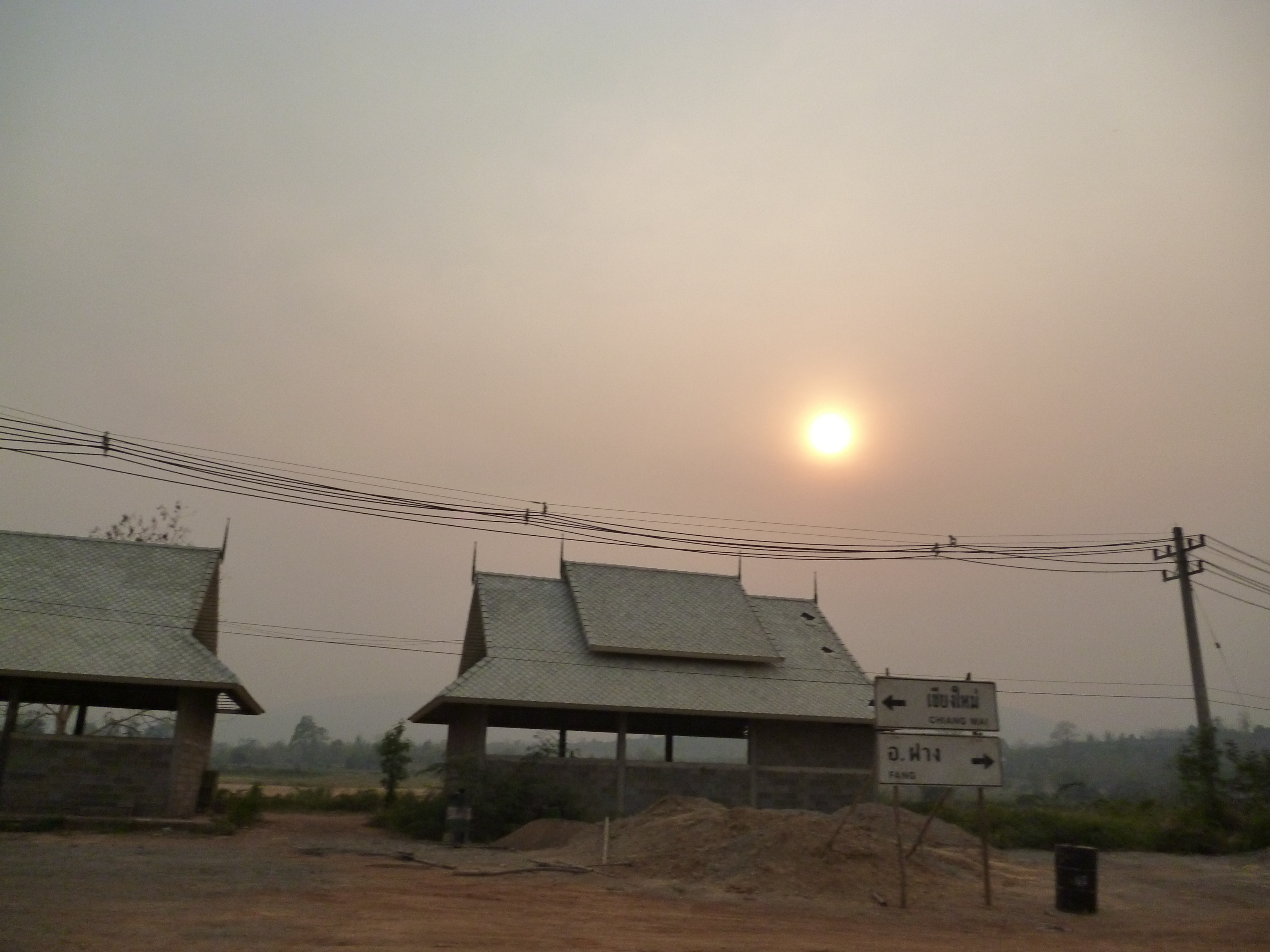 As the sun started setting we started seeing signs for the Cave Temple. As the haze hanging over the region obscured the sun and created a beautiful image of a blazing sun going down behind the mountains I started to not mind having been on the back of a scooter for the past five hours. And it’s a good thing too because once we got to the cave temple a sign indicated that it had closed half an hour earlier. Fuck my life.