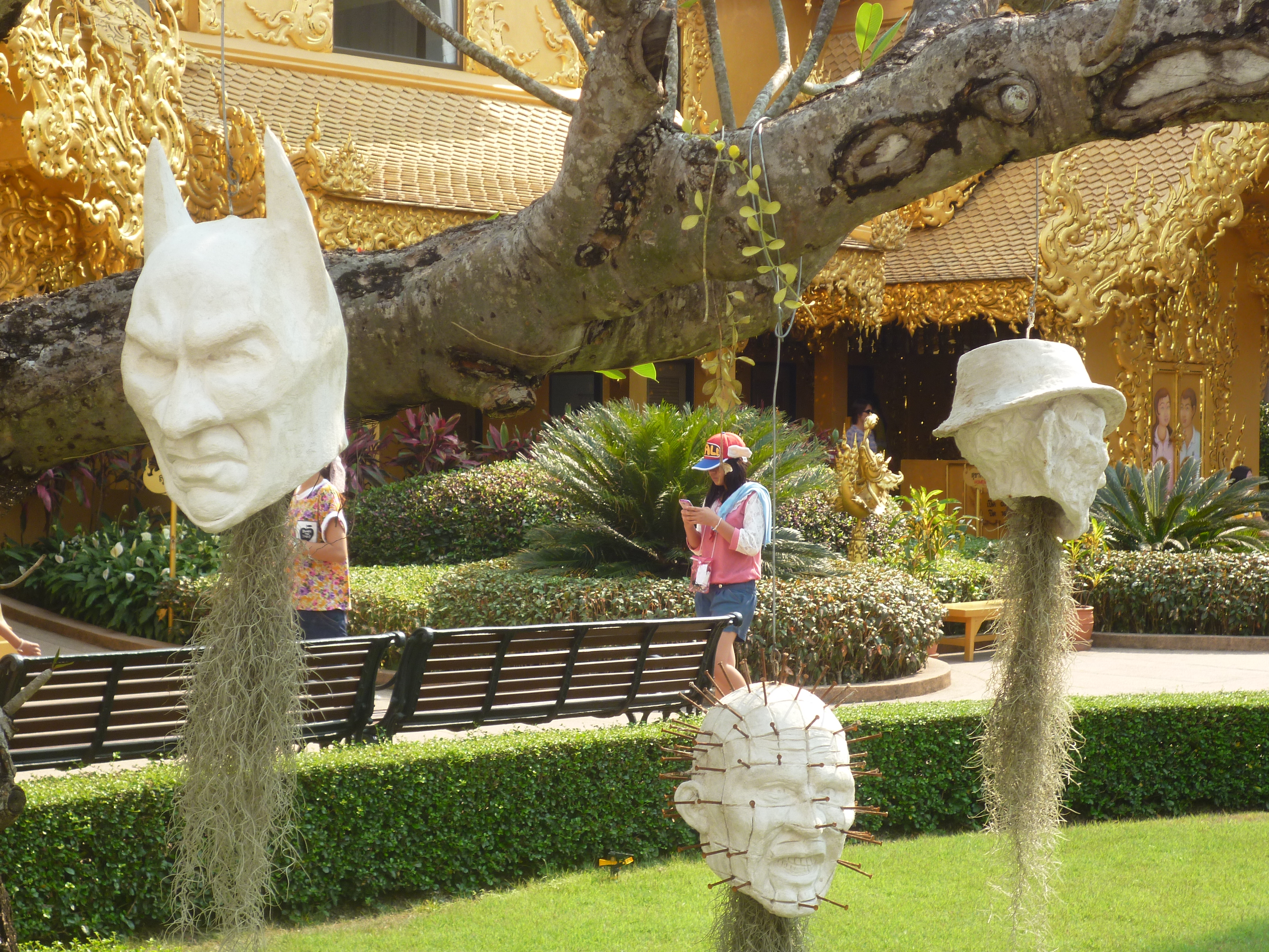 Wat Rong Khun is the poo – so take a big whiff.Chiang Mai 176While it has the typical features of a Buddhist temple –  layered, triangular, shingled roofs, mythical creatures, Nagas and whatnot, I’ve never seen a temple done in all white, and I’ve certainly never experienced one that features Predator, Batman and Freddie Kreuger among its guardians. The designer of the temple, Chaloemchai Khositphiphat (I obviously looked his name up as I’m pretty sure knowing that name off hand is next to impossible for a Westerner) is a well known, local Buddhist artist who’s been developing the temple as funding rolls in.  The whole thing is done in a white aesthetic, and is made to represent crossing into the afterlife while lost souls reach up for you as you pass over the bridge into the religious sanctuary.  It somehow took my breath away, was slightly creepy and made me laugh at yet another bizzare Asian interpretation of Western culture, all at the same damn time.  Chiang Mai 174Chiang Mai 171Chiang Mai 194Chiang Mai 182