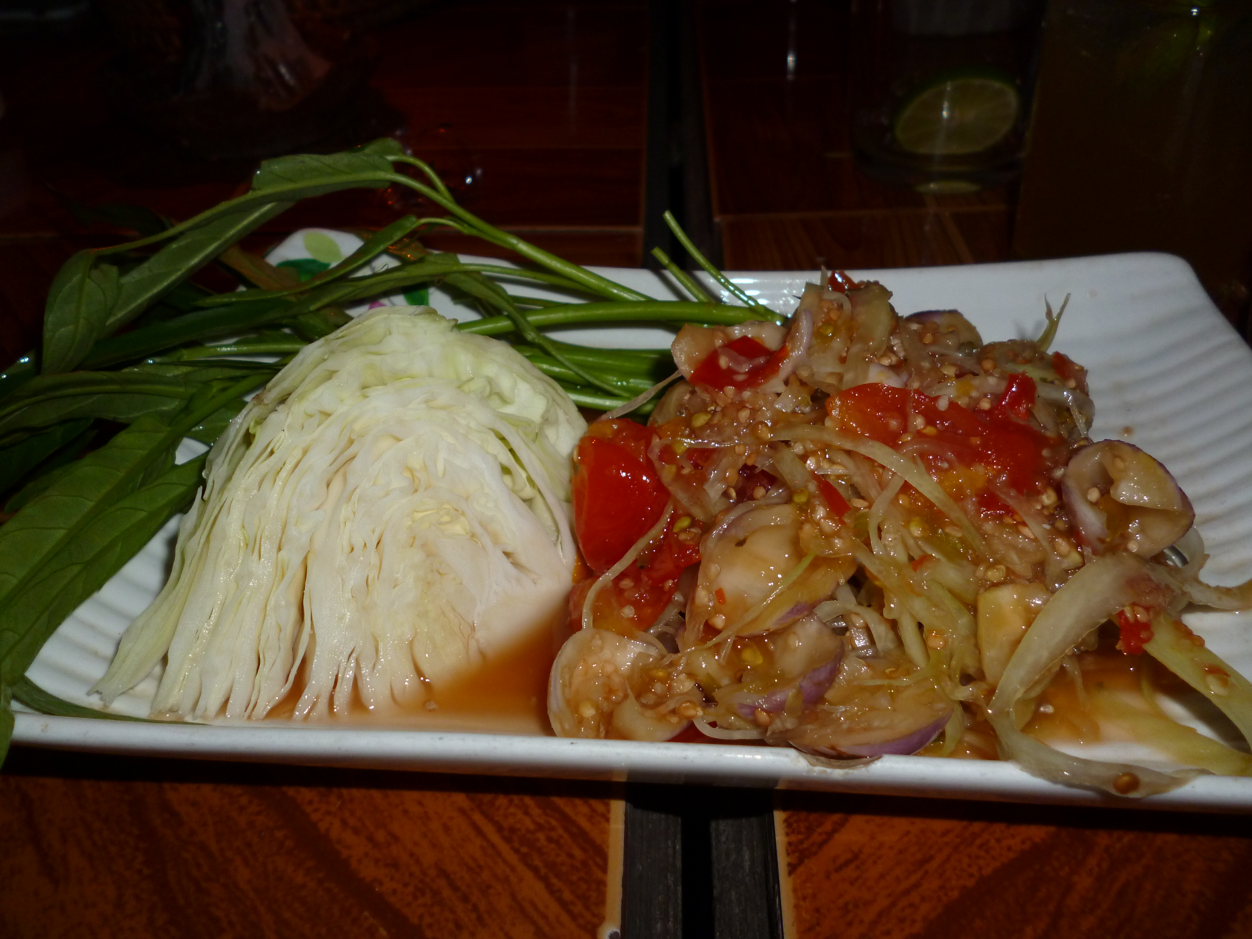 I almost died.  This was by far the spiciest thing I had ever eaten in my life, and also one of the best tasting spicy dishes I had ever had. The crunch of the fresh papaya, with the salt from the fish sauce the sweetness from the peanuts, acid from tomatoes and the sharpness of the onions, ughhhh I’m getting so hungry just thinking about it.  I couldn’t stop eating it.  I also couldn’t stop my nose from running, or my fingers from pinching stolen bites from everyone’s sticky rice to keep my mouth from spontaneously combusting.  The cabbage was also sort of refreshing, but really the chilis reigned supreme.  I finished every bite of my dish thought my tears of pain.